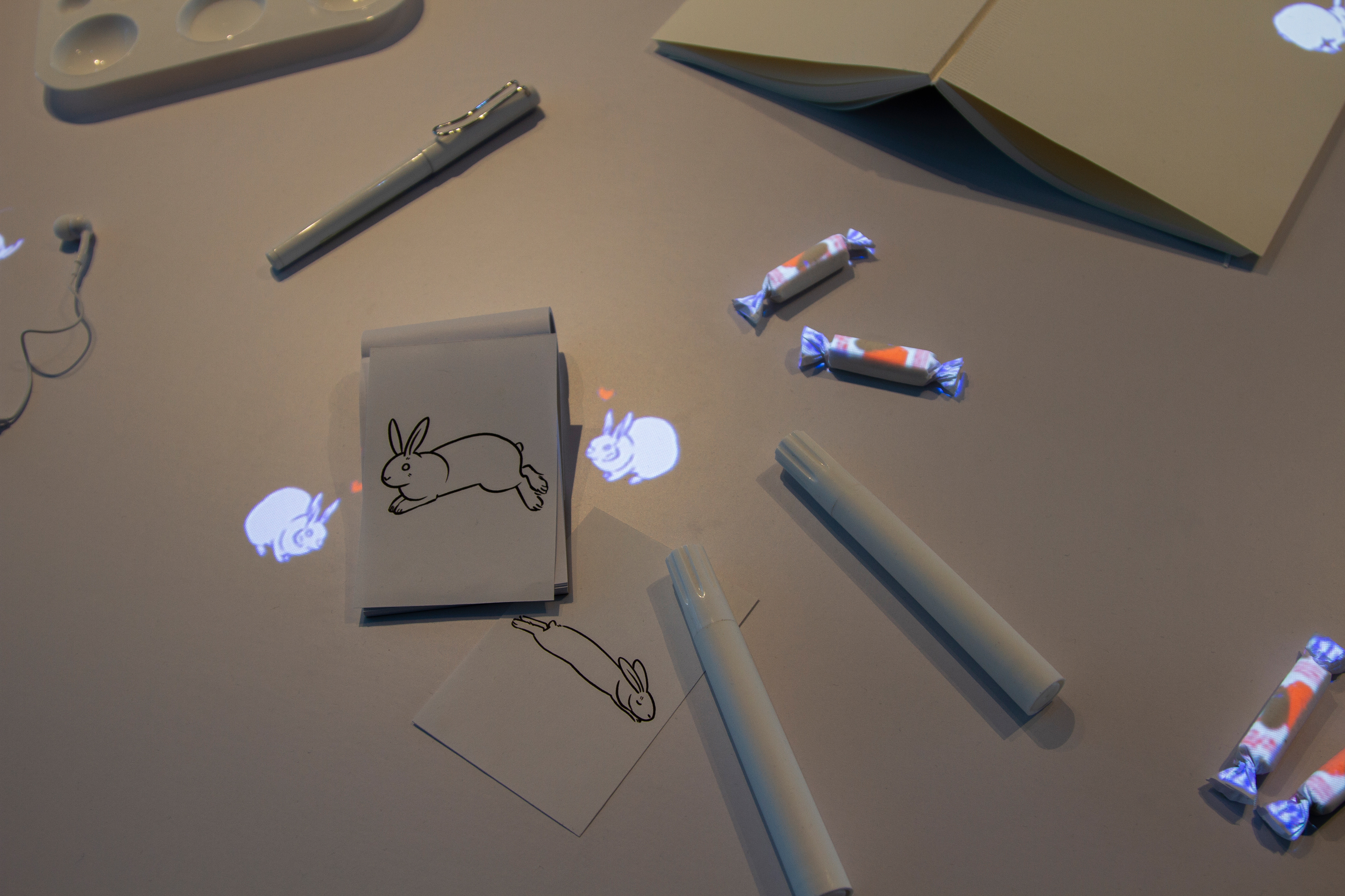 I was introduced to Emily (IG: @kwaemily) and Matthew (IG: @siayk), a graphic designer + installation artist power couple, by Nani (IG: @nanimonda), a talented animator. The project involved projection and interaction through sound. Rabbits who had secretly escaped their candy wrappers were to explore the object-strewn table and jump back into the wrapper when there was a sound near by.